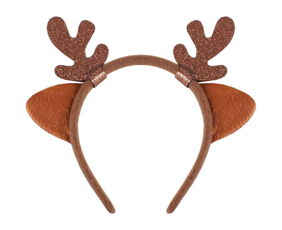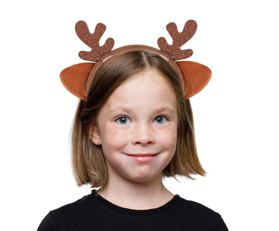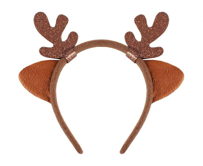 Plastikowa opaska do włosów, obszyta jest brązowym materiałem. Do opaski doczepione są małe rogi jelonka oraz uszka. Poroże jest w brązowym kolorze wykonane z filcu z usztywnieniem.