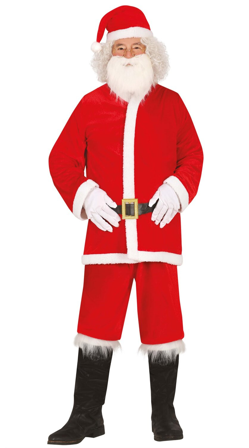 Strój Świętego Mikołaja składa się z miękkiej bluzy z długim rękawem. Bluzka wykonana jest z czerwonego materiału typu welur średniej grubości. Bluza z białym futerkiem z polaru, który wykańcza mankiety, kołnierz, na dole przebrania oraz tworzy pionową plisę na przodzie. Ubiór nie posiada zapięcia. W zestawie znajdują się także proste, długie spodnie w kolorze czerwonym. Spodnie posiadają mają wszyty sznurek w pasie. Kostium dopełnia połyskujący pas z tworzywa imitującego skórę ze złotą plastikową klamrą. Całość uzupełnia czerwona czapka Świętego Mikołaja z białym pomponem oraz białym futerkiem na obwodzie, a także biała broda mocowana na gumce.