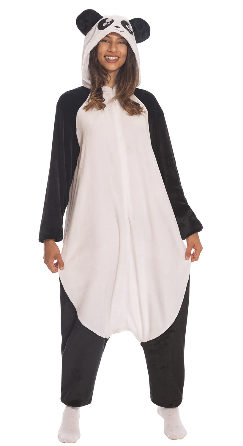 Jednoczęściowy kombinezon misia pandy z kapturem w stylu kigurumimi. Wykonany z miłego w dotyku, biało - czarnego materiału. Zapinany z przodu na suwak, z tyłu posiada doszyty okrągły czarny ogonek. Mankiety i nogawki wykończone na prosto, bez ściągacza. Do kaptura doszyte są uszy oraz naszywki oczu i noska.