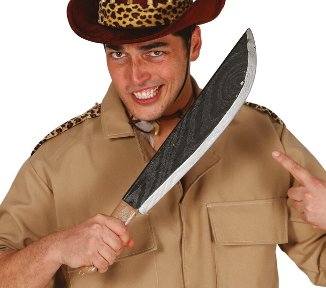 Maczeta wykonana jest z plastiku. Rączka tasaka ma beżowy kolor i wyprofilowana jest jakby zrobiona była z drewna, ostrze w czarnym kolorze ze srebrnym rantem. Super dodatek do stroju odkrywcy dżungli, pirata czy szaleńca - mordercy na Halloween.