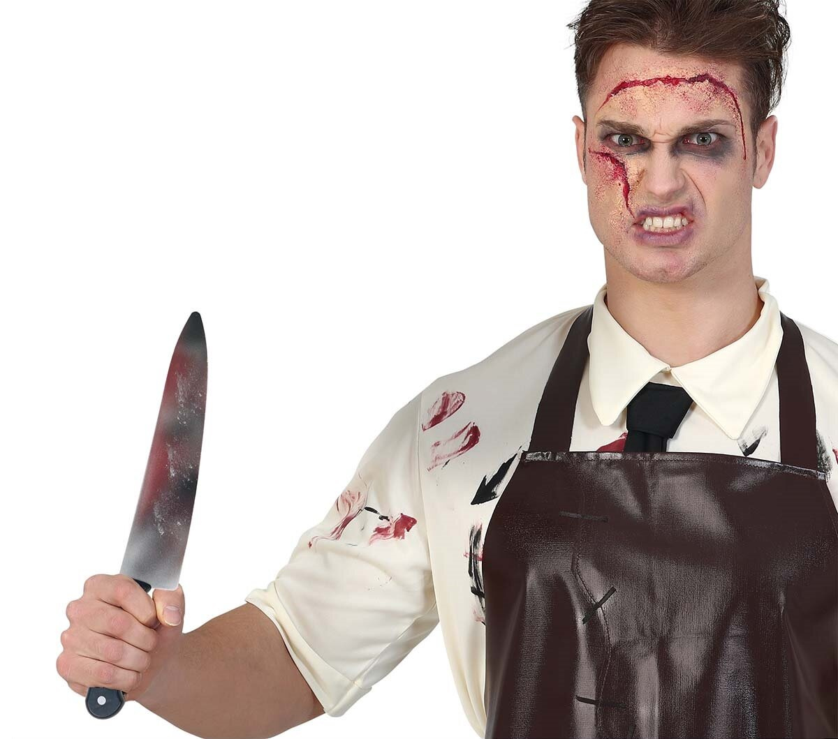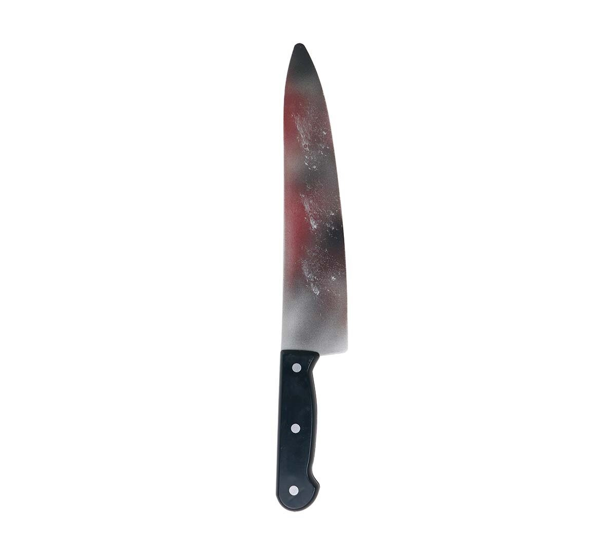 Nóż kuchenny wykonany jest z plastiku. Rączka tasaka ma czarny kolor, ostrze w jasno szarym kolorze ma czerwony brzeg i liczne kropeczki, jakby było ubrudzone od krwi. Super dodatek do stroju kucharza, rzeźnika, szaleńca - mordercy na Halloween.