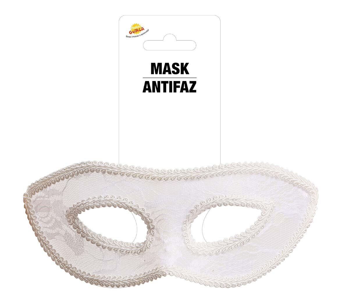 Maska wykonana z tworzywa, wyprofilowana żeby dobrze przylegała do twarzy. Maska na zewnętrznej stronie pokryta jest białą koronką. Maseczka dookoła oraz wokół oczu ozdobiona jest białą, plecioną tasiemką. Wiązana na tasiemki.