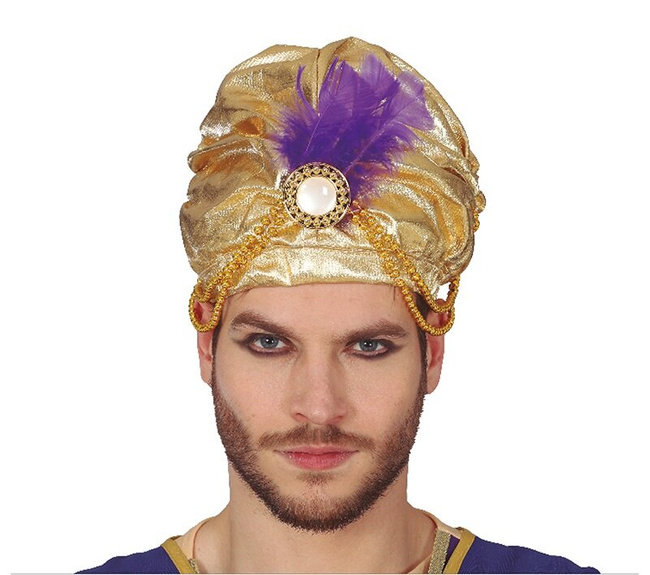 - Złoty turban radży ozdobiony dwoma rzędami pozłacanych korali. Na przodzie umocowane fioletowe piórka oraz biały ozdobny kamień. Nakrycie głowy posiada gumkę na obwodzie i jest lekko usztywnione. Turban godny szejka i perskiego księcia.
